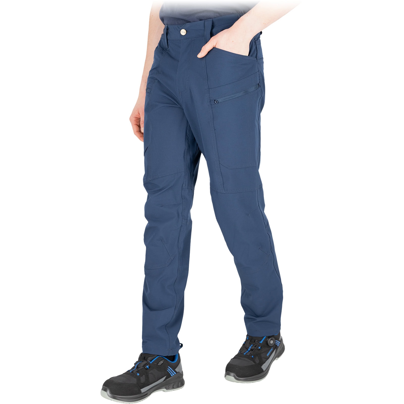 Obľúbené pracovné nohavice do pása FORCE majú skvelý strih, a dvojitý materiál v oblasti kolien prispôsobený na vloženie chráničov kolien. Penové chrániče kolien chránia kolená a zjemňujú tlak v kolenách pri kľačaní.
